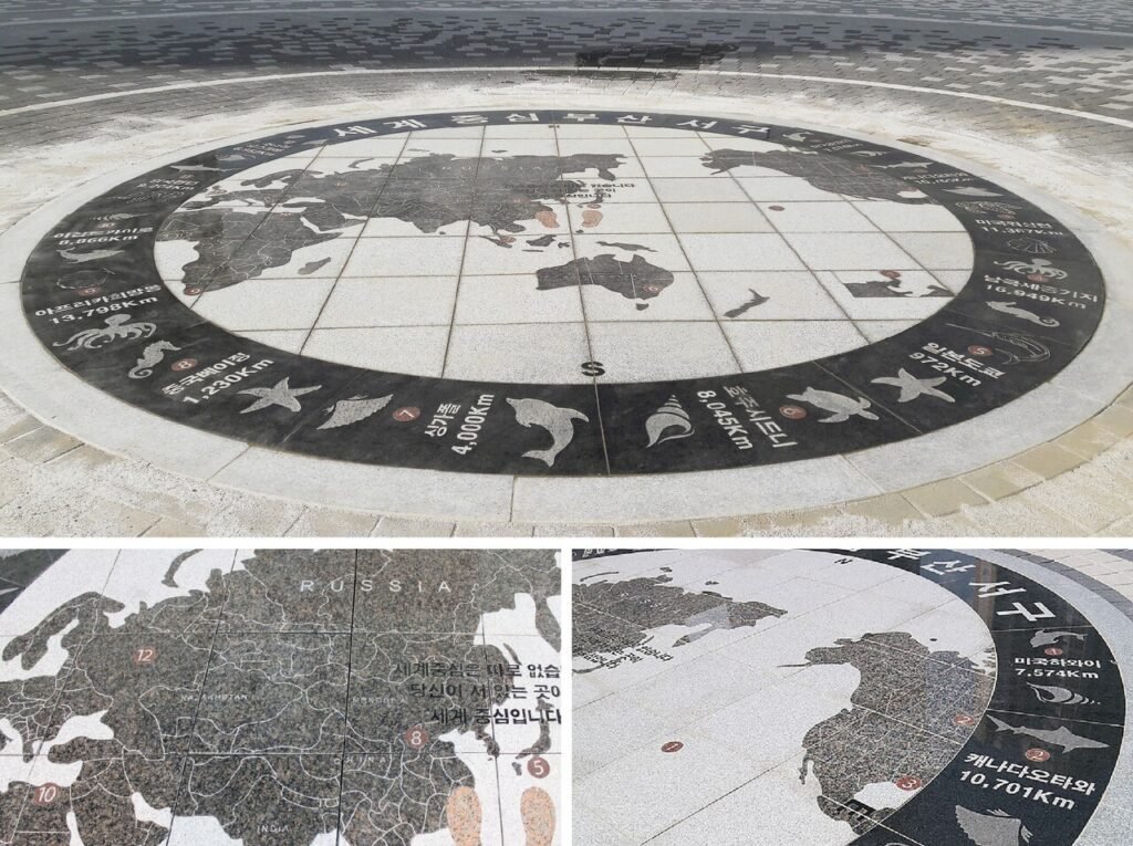 Au cœur de la place de la Jeunesse du parc océanique de Songdo à Busan se déploie un art floor circulaire représentant une carte du monde. Cet espace dépasse la simple fonction de passage pour offrir aux visiteurs l’expérience symbolique de se tenir « au centre du monde ». Les continents, exprimés par des contrastes de teintes de pierre, ainsi que les indications de distance entre les pays et les icônes de la faune marine, apportent à la fois une dimension pédagogique et un plaisir visuel.